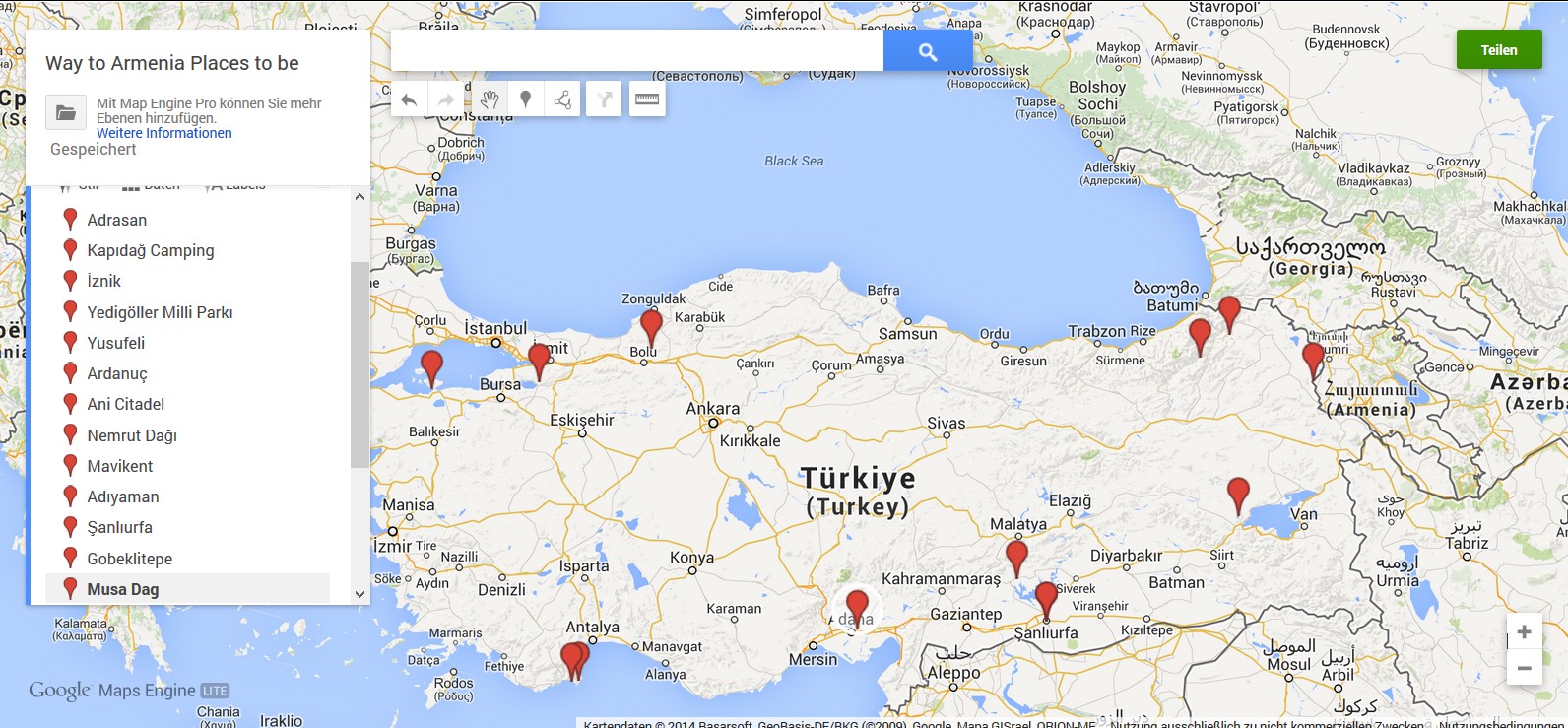Allerdings eröffnet das trotzdem unzählige Wege, um nach Armenien zu kommen, wenn man nicht wie bisher einfach den schnellsten Weg wählt. Und auf dem Weg gibt es einiges, was wir sehen möchten! Deshalb hat Eva eine Karte mit möglichen Etappenzielen erstellt. Sie ist offen für weitere Einträge, also fühlt Euch frei, uns Tipps hineinzuschreiben, wir freuen uns darüber!