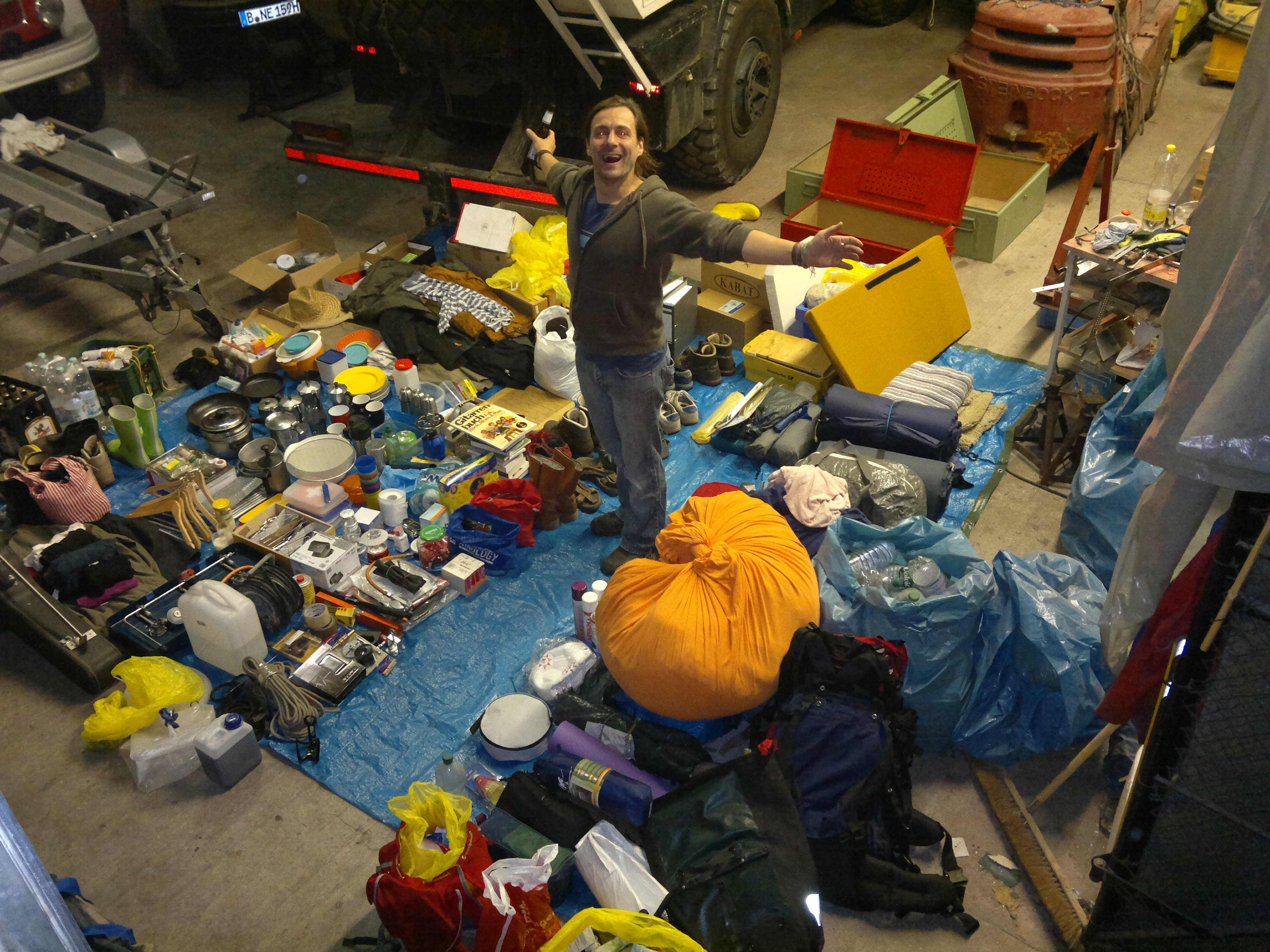 Die Stapel sehen zwar erstmal groß aus, aber jetzt auch wieder nicht riesig. Wir tragen am Ende 8 große und kleine Taschen aus der Wohnung. Zwar sind wir nicht ganz zufrieden mit unseren Minimalismus-Künsten, aber es ist OK. Das böse Erwachen kommt allerdings noch. Denn als wir beim Magirus ankommen und ich munter alles einräumen möchte, fällt uns auf, dass der dicke Kerl mit allem, was wir in den letzten Monaten gefunden und gekauft haben vollgeräumt ist. Jede Schranktür, die wir öffnen enthüllt neue Berge. So ist es nichts mit einräumen, stattdessen räumen wir erstmal aus. Robert bringt die Wasserpumpe in Schwung, was inklusive Reinigung der Wassertanks am Ende auch 5 statt wie erwartet 2 Stunden dauert.