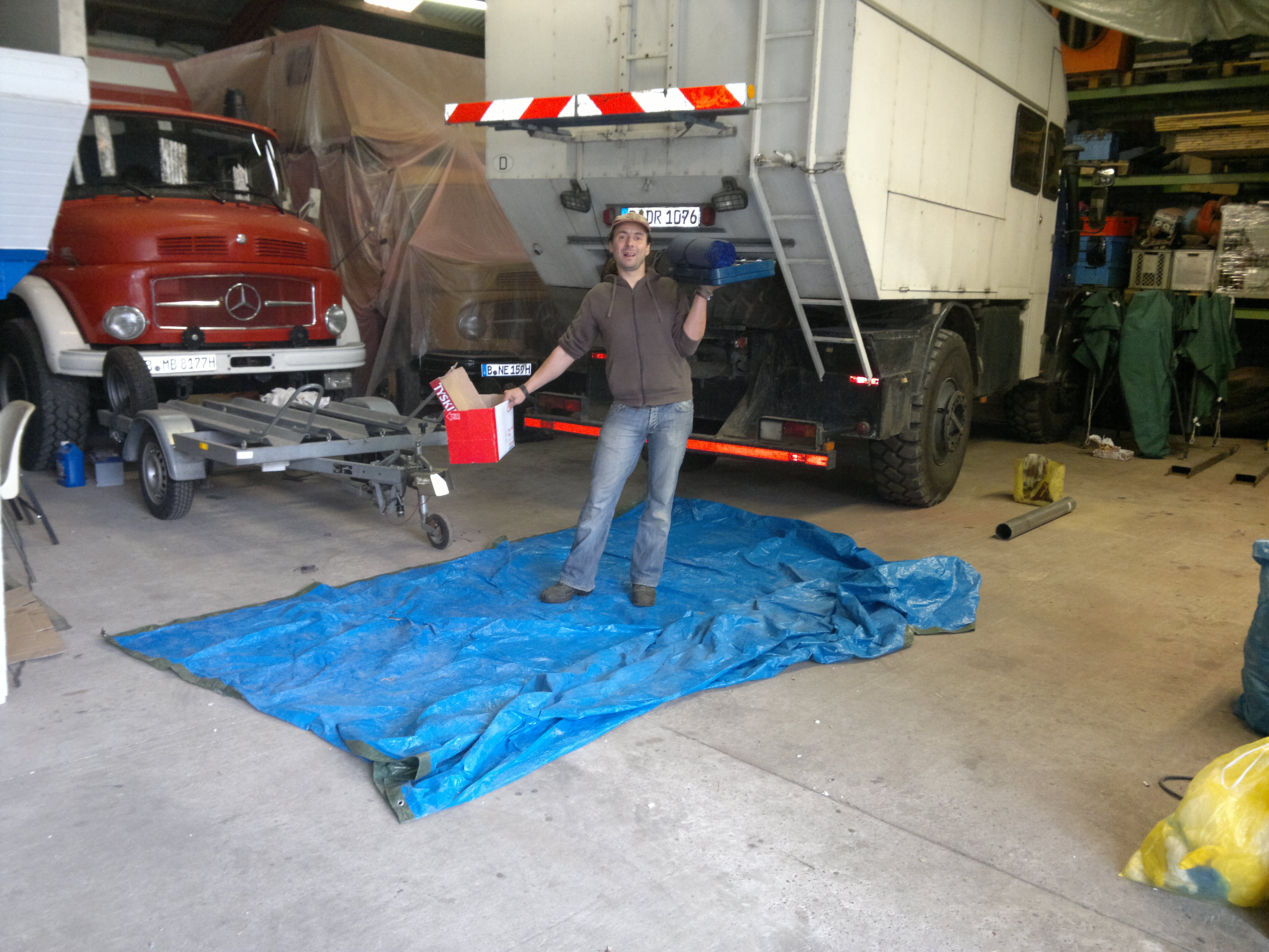 Ich renne derweil gefühlte 100 Mal rein und raus aus dem Magirus und fördere auf einer 4 mal 4 Meter großen Plane die ganze Wahrheit zutage. Unser beider Augen weiten sich zunehmends vor Staunen, was da alles herauskommt. Am Ende ist kaum ein Zentimeter der Plane mehr frei.