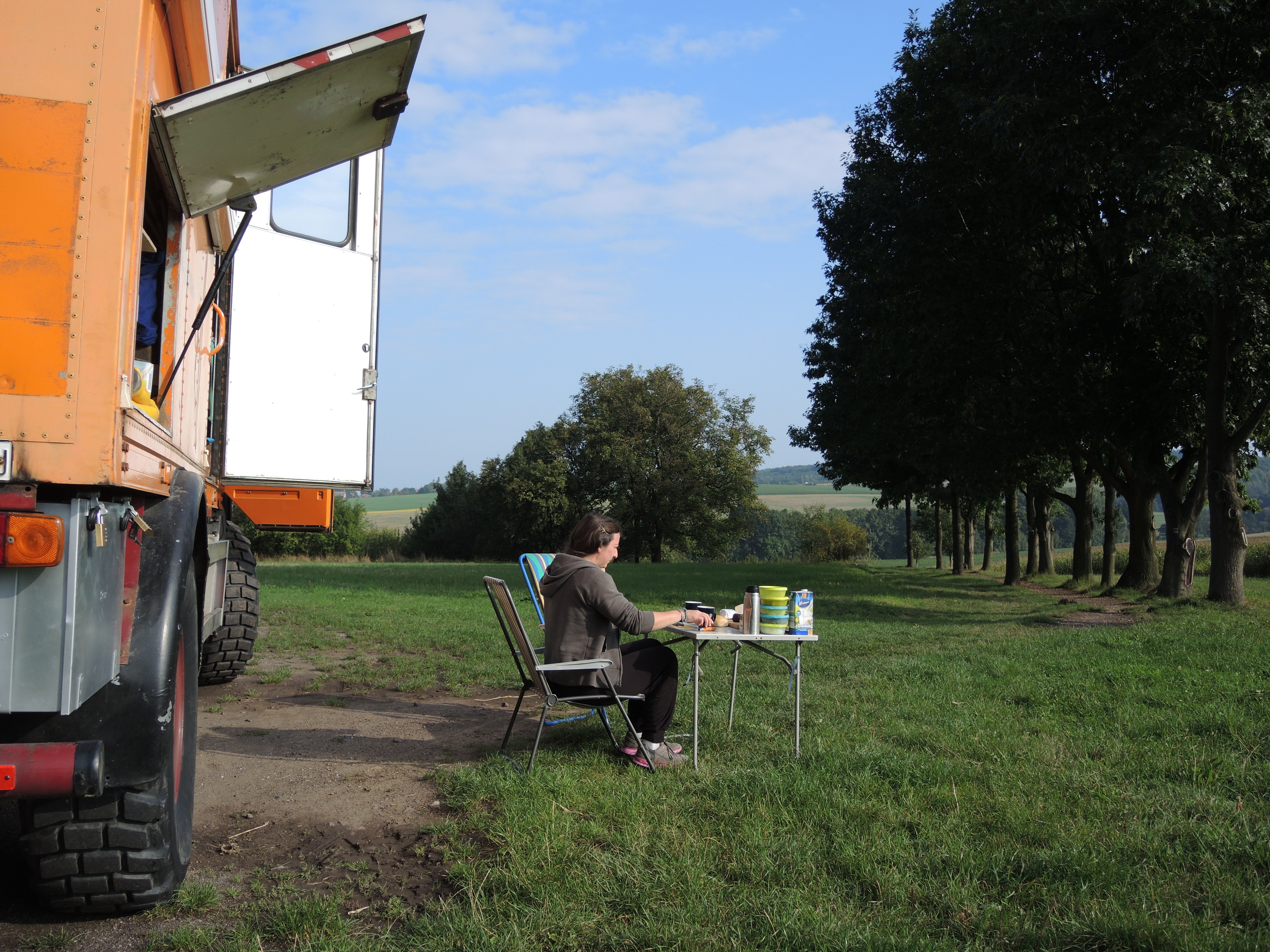 Als sie später wieder vorbeikommen, sind wir immer noch da. Ro versteckt den hässlichen schwarzen Himmel im Fahrerhaus unter schönen bunten Tüchern, die er auf der Fusion von einem Berg alter Klamotten geklaubt hat und fixiert sie dann mit frisch abgeschälten Holunderbuschgerten. Ich übe fotografieren nah und fern, Vordergrund, Hintergrund scharf usw. Da kommt ein Tscheche um die Ecke gebogen und spricht uns auf Deutsch an. Er sei in Tegel in den 7oer Jahren auch Magirus gefahren. Die seien unkaputtbar. Das haben wir nun schon öfter gehört und versichern, dass auch wir fest daran glauben. Er ist auf einem Ausflug mit seiner Frau und froh, einen Gesprächspartner gefunden zu haben. In der nächsten Stunde erfahren wir, dass er lange in Berlin gelebt und gearbeitet hat, dass damals die Proteste gegen den Vietnamkrieg waren, die ihm sehr imponiert haben. Dass es heutzutage keine vergleichbaren Proteste gebe, obwohl wir gerade im Begriff seien uns von den Amerikanern in einen Krieg gegen Russland treiben zu lassen. Dass Joschka Fischer uns vor einem Krieg im Irak bewahrt habe. Dass niemand Krieg wolle, ausser die Amerikaner.