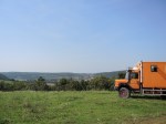 Wir machen stopp in Lucenec, einer nicht weiter erwähnenswerten Kleinstadt, und checken Mails, was leider aufgrund der Schwierigkeiten, mit dem Dicken in die Innenstadt zu kommen, mal wieder länger dauert als geplant, weshalb wir zum Übernachten einmal mehr auf einer Wiese nahe einer Seitenstraße landen. Sehr schöner Blick!