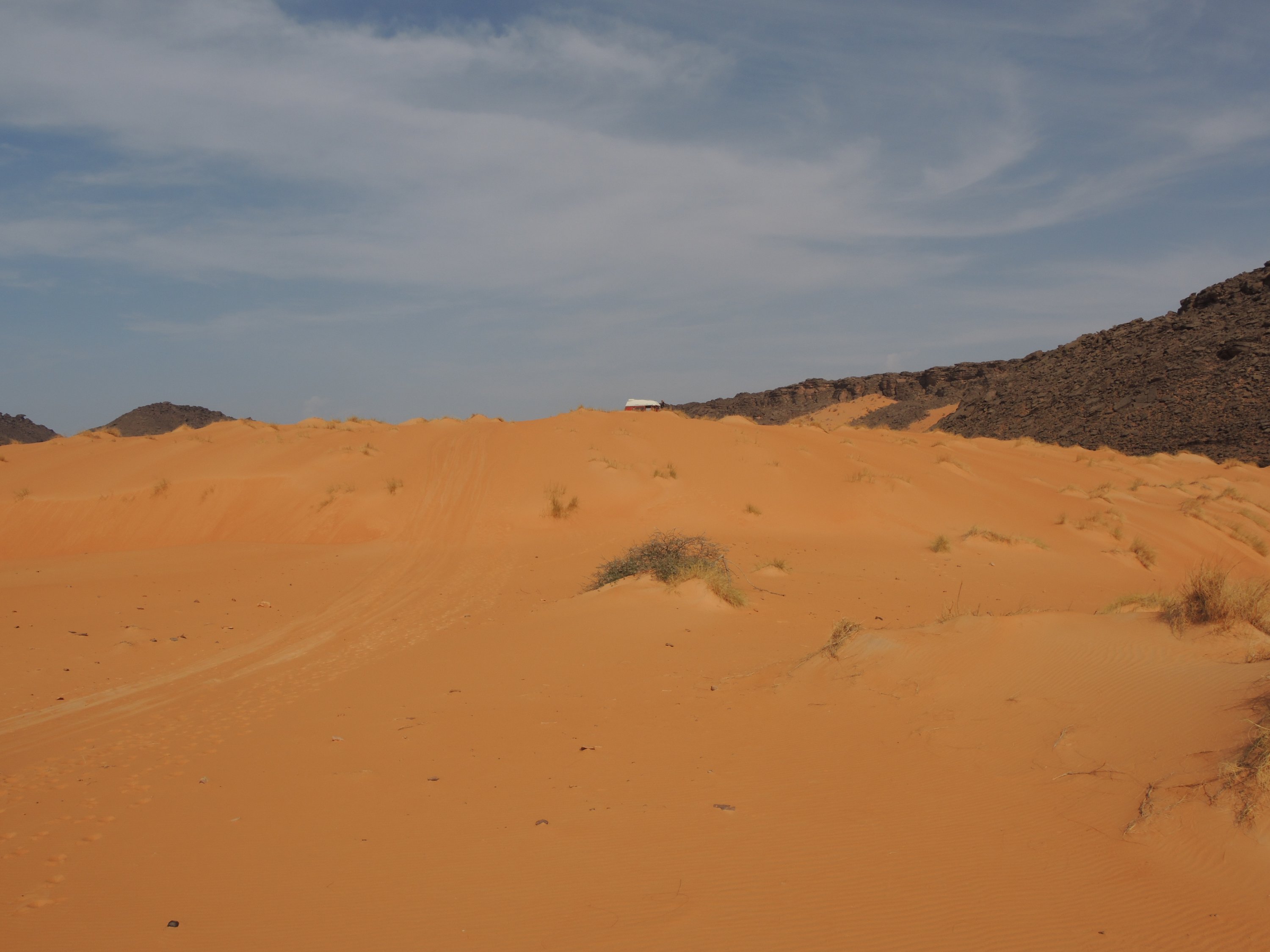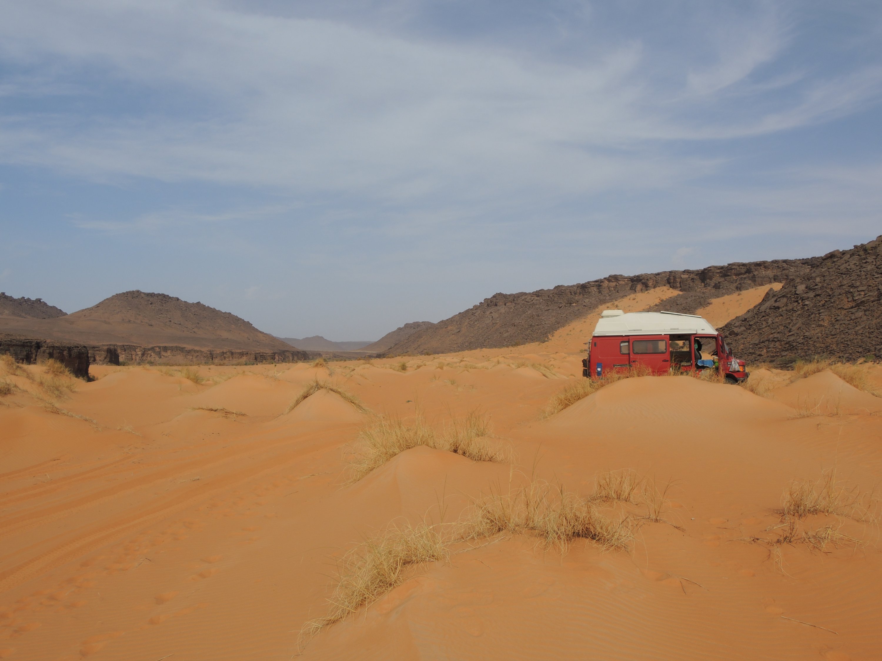 Die drei im Dorf verbliebenen Männer jedenfalls lassen es sich nicht nehmen, uns am nächsten Morgen einen Besuch abzustatten. Nach einem kurzen aber herzlichen arabisch-französisch-handzeichen-gebenden Gespräch gehen sie zufrieden in ihr Dorf zurück. Nicht ohne uns nochmals genau erklärt zu haben, wie wir zum Krater Aouelloul kommen. Einer der Männer baut sogar aus Sand und Steinen den Geländeverlauf nach: über zwei Berge und durch zwei Täler. Auf jeden Fall am Kompass geradeaus und am Ende nochmals über einen Berg, erklärt er in schlechtem Französisch. Verstehen wir soweit, aber was meint er mit Kompass? Egal, wir fahren los und siehe da, einige Kilometer später verstehen wir, was mit Kompass gemeint ist. Wir fahren wie angewiesen geradeaus, bahnen uns wenig später unseren Weg durch den Irrgarten eines großen Sicheldünenfelds, in dem ich dann leichtfertig fast steckenbleibe und schlagen schließlich unser Domizil auf dem Bergrücken des mittleren der drei zu querenden Berge auf. Wieder einmal sind wir verzückt ob der Vielfalt, die die Wüste zu bieten hat. Rot und weiß, die Piste sandverweht und kaum noch zu erkennen windet sich unsere Strecke durch mal steinige, mal felsige bizarre Landschaften. Mehrere Tage lang sehen und hören wir keine Menschenseele. Unvertraut und irgendwie archaisch.