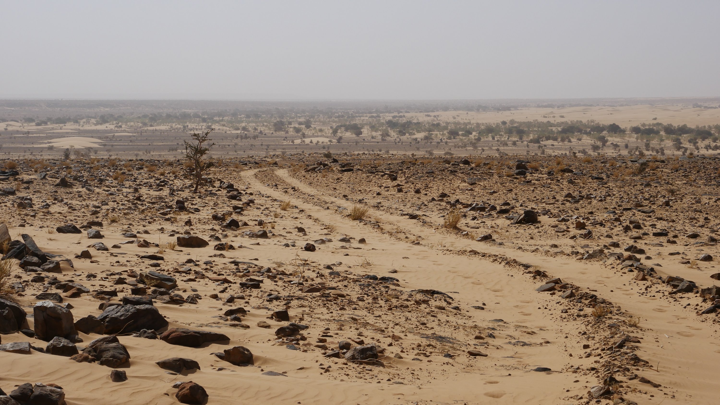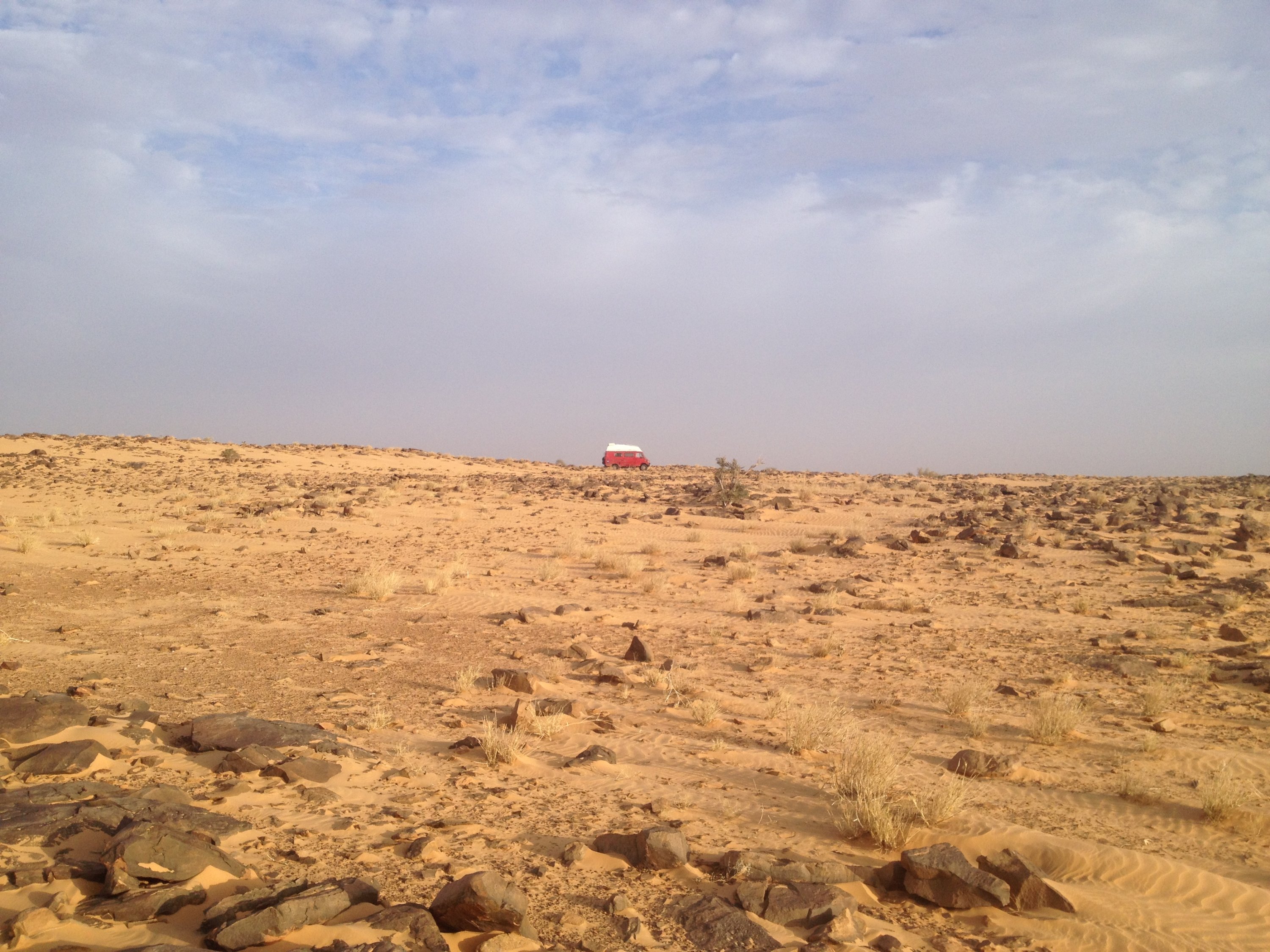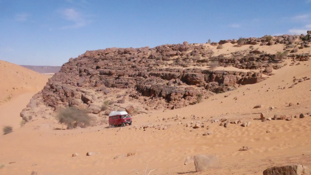 Wir wählen das Vallee Blanche als Ziel, weil es nah an Atar liegt und keine schweren Dünenpassagen hat. Denn so ganz vertrauen wir der Reparatur anfangs noch nicht. Kurz hinter der Abzweigung auf die Teerstraße nach Tidjikja geht die Piste links von der Nationalstraße nach Nouakchott ab. Wir biegen ein und fahren nicht mehr weit, bis wir unseren Schlafplatz für heute nacht entdecken und einfach um 15 Uhr mitten in der Wüste den Motor ausschalten und stehen bleiben.