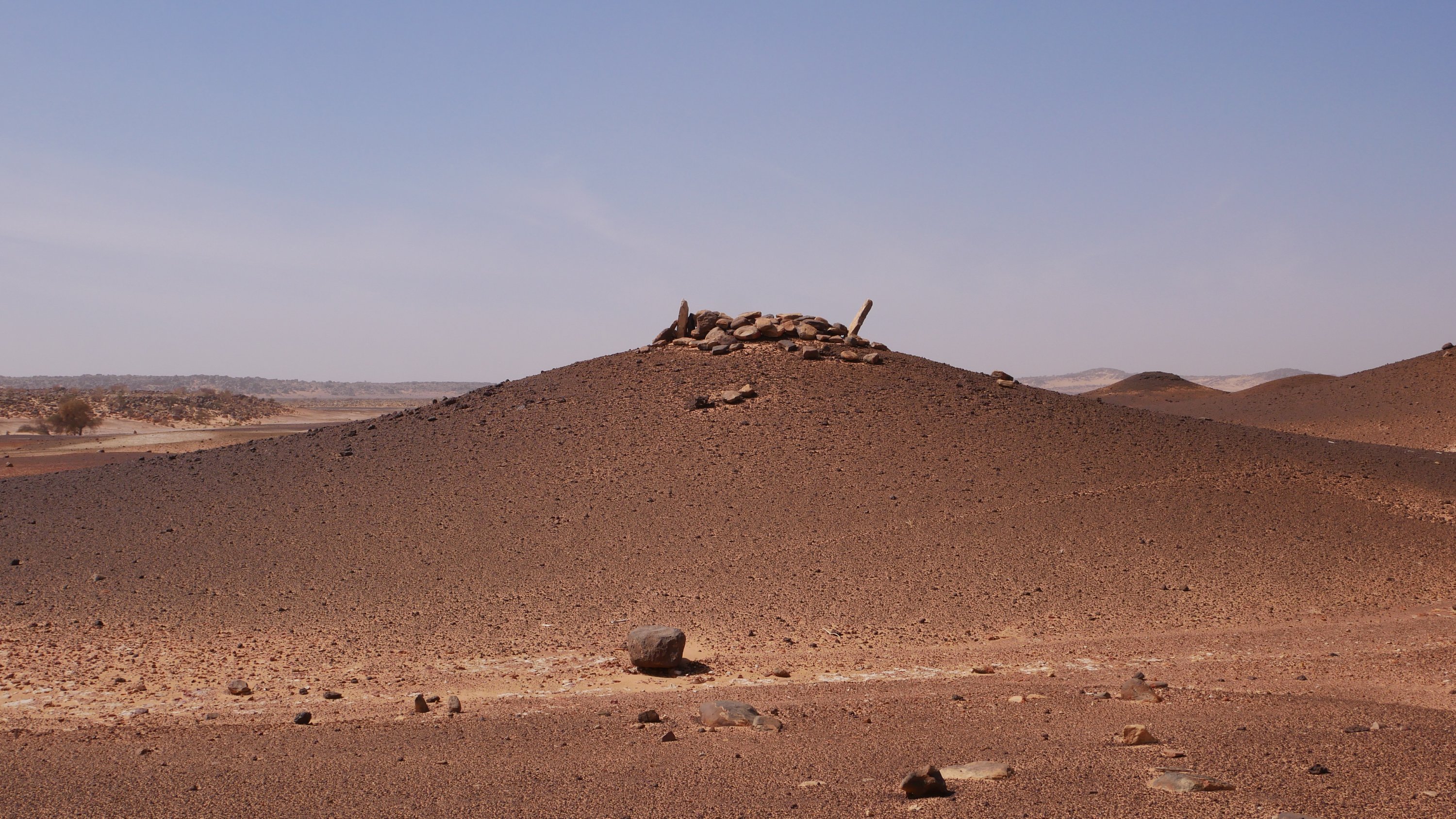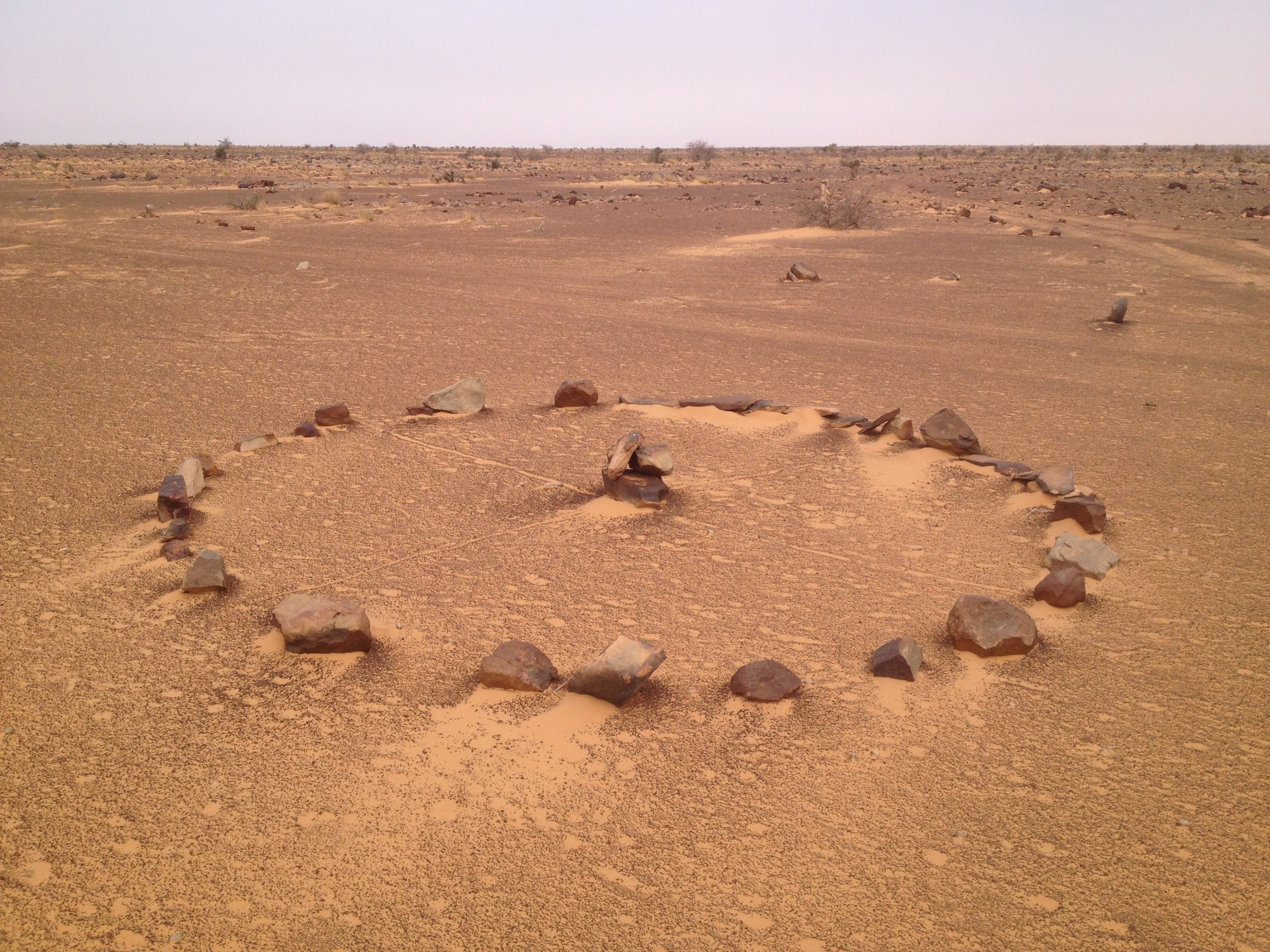 Nur wenige Kilometer später sieht es schon wieder ganz anders aus. Kleine Tüpfeldünen aus roter Erde umflossen von weißen Salzkrusten prägen die Landschaft. Das ist so besonders, dass die Mauritanier auf dem Rücken dieser Kleinstdünen die Gräber ihrer lieben Verstorbenen angelegt haben. Wie immer, Grabstein gen Mekka.