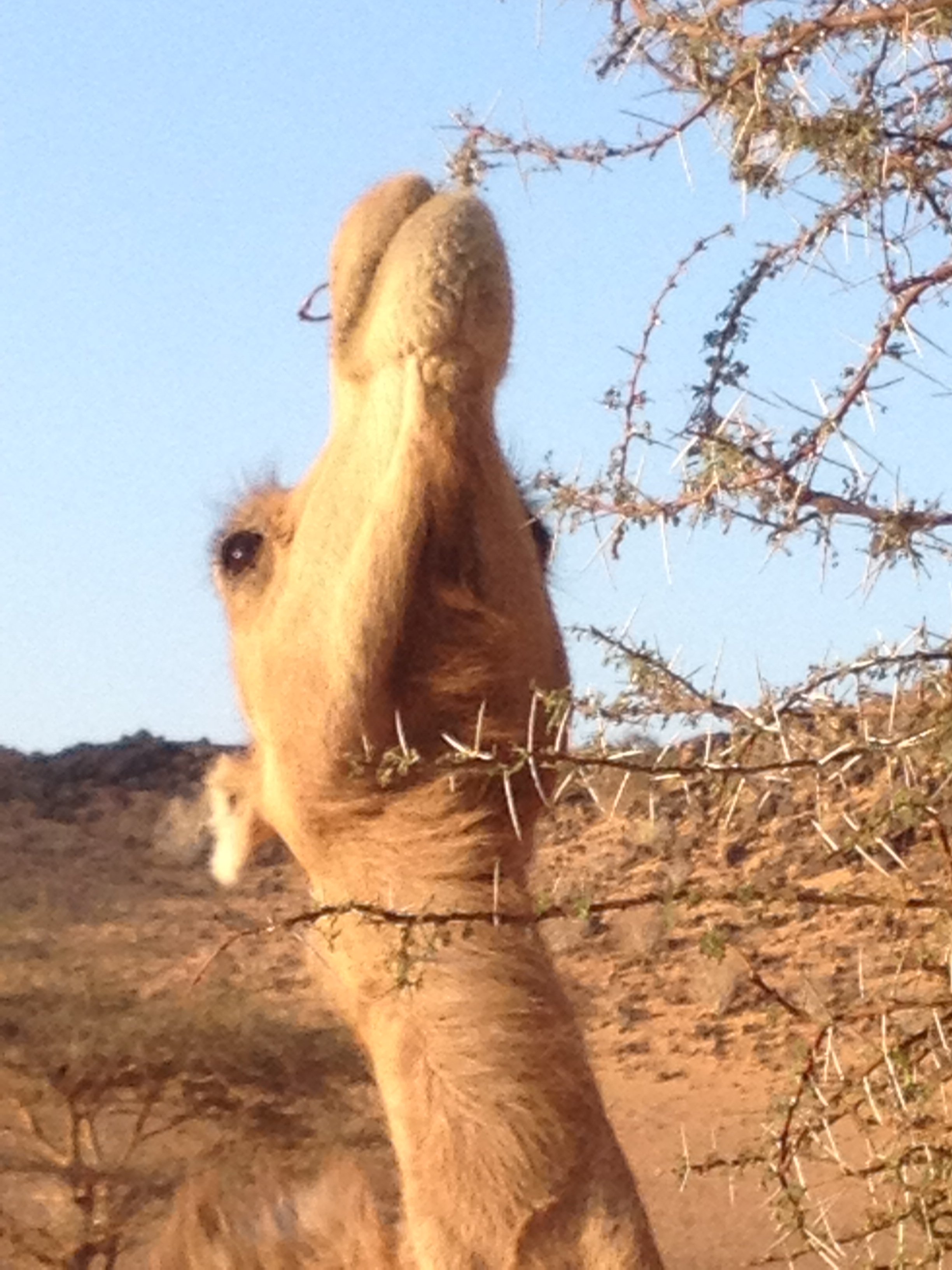 Gegen Abend erreichen wir dann unser Etappenziel, den Krater Aouelloul. Ziemlich unspektakulär hat er doch einen entscheidenden Vorteil gegenüber unseren letzten Übernachtungsplätzen: er ist windgeschützt. Außer uns ist noch eine Berberfamilie zugegen, die den selten vorbeikommenden Touristen gerne Schmuck oder Teekannen verkaufen möchte. Und gegen Abend kommt noch ein Nomade mit seinen 6 oder 7 Dromedaren an – die hier übrigens auch Kamele heißen, obwohl sie nur einen Höcker haben – und übernachtet ebenfalls im Krater, der etwa 100 Meter im Durchmesser hat und dessen Krateraußernwände vielleicht 10-15 Meter hoch sind. Da wir neben dem einzigen Baum weit und breit stehen bekommen wir am nächsten Morgen Besuch.