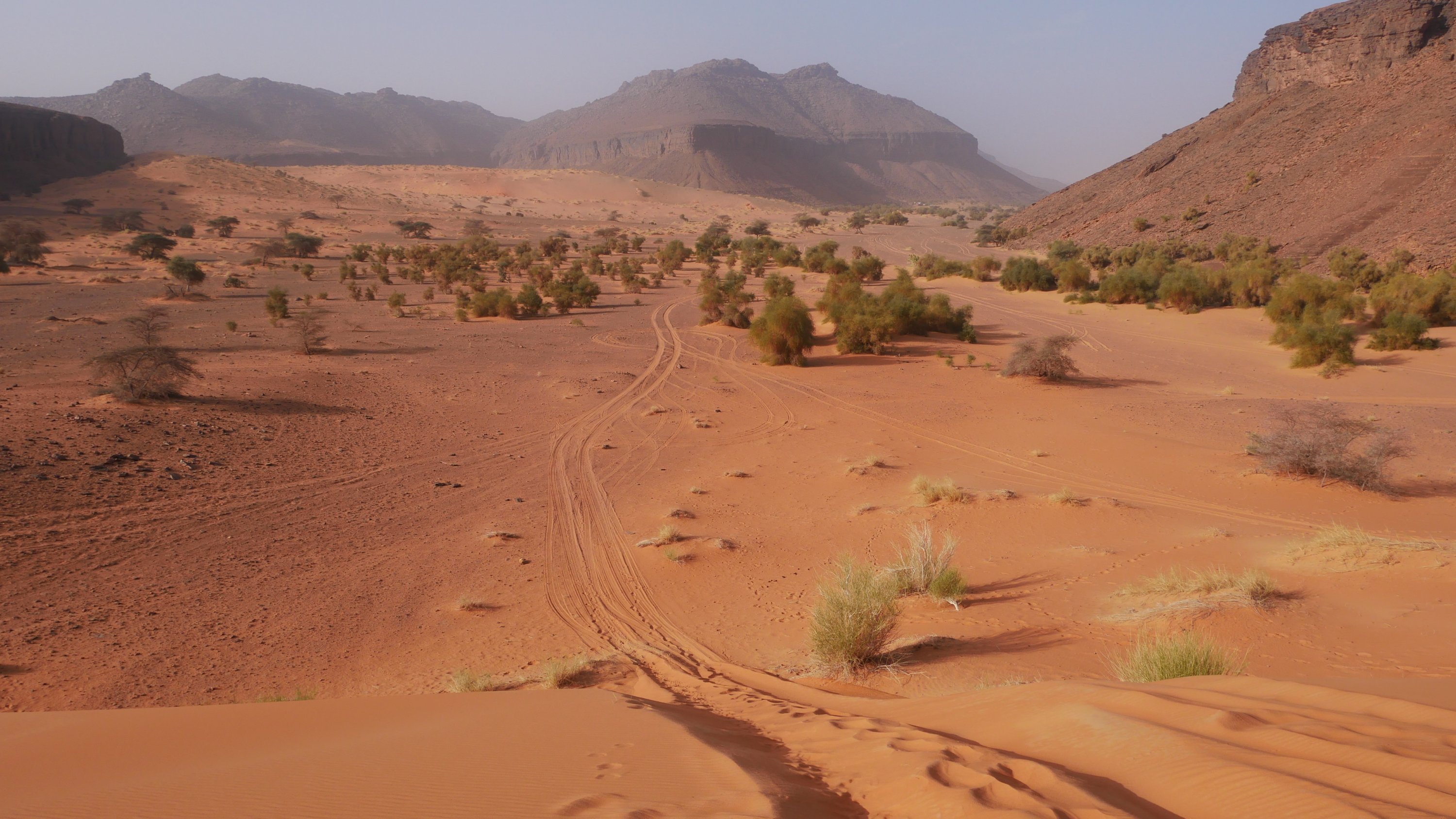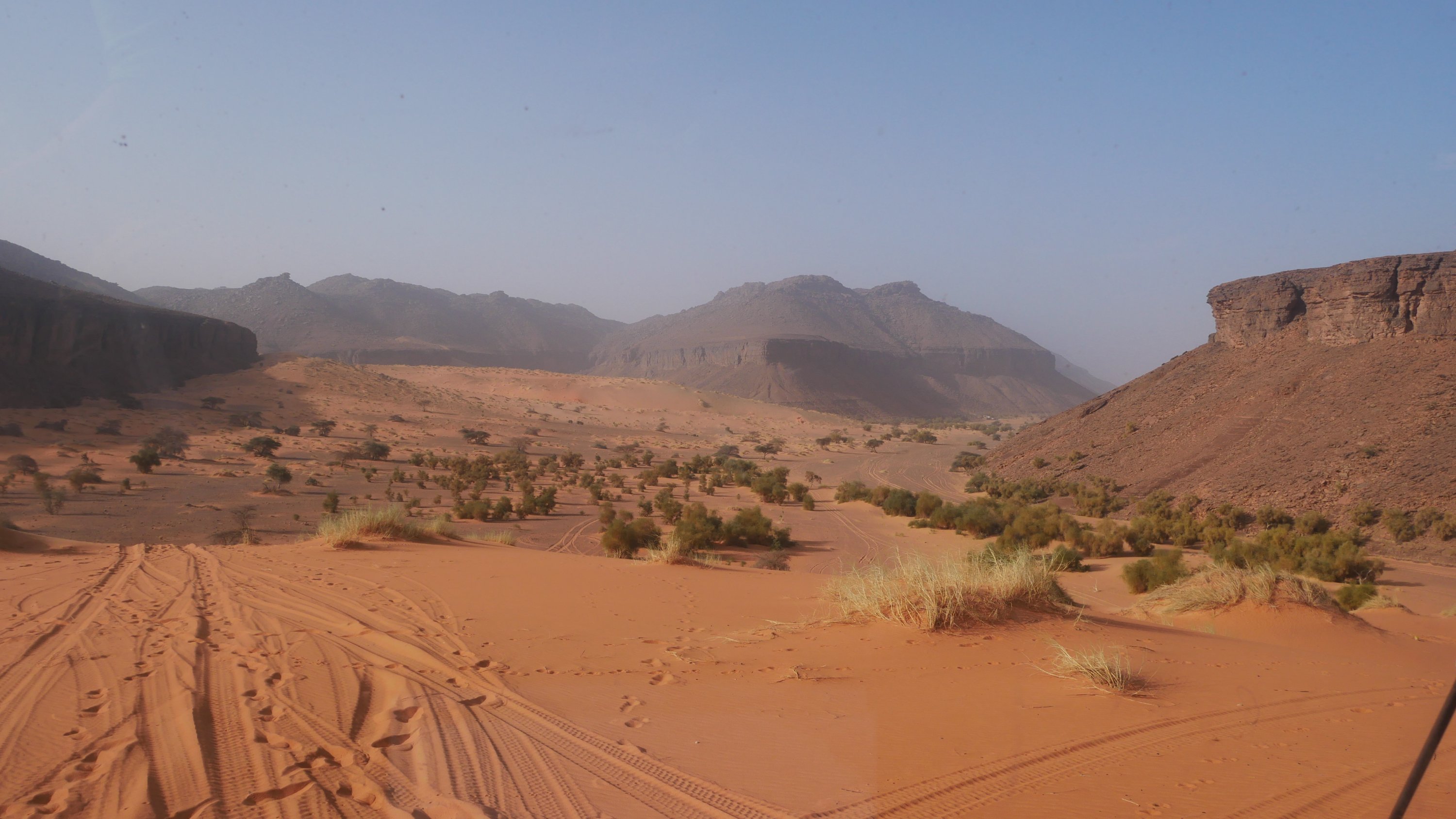 Morgens lassen wir uns Zeit und genießen die Weite, dann machen wir uns langsam auf. Wir folgen einem breiten teils sandigen, teils steinigen Tal, das eingefasst ist von Tafelbergen aus dunklem Stein, an die sich Sanddünen anschmiegen und an deren Fuß grüne Palmwedel ahnen lassen, dass hier zumindest einen Teil des Jahres über Wasser fließt.