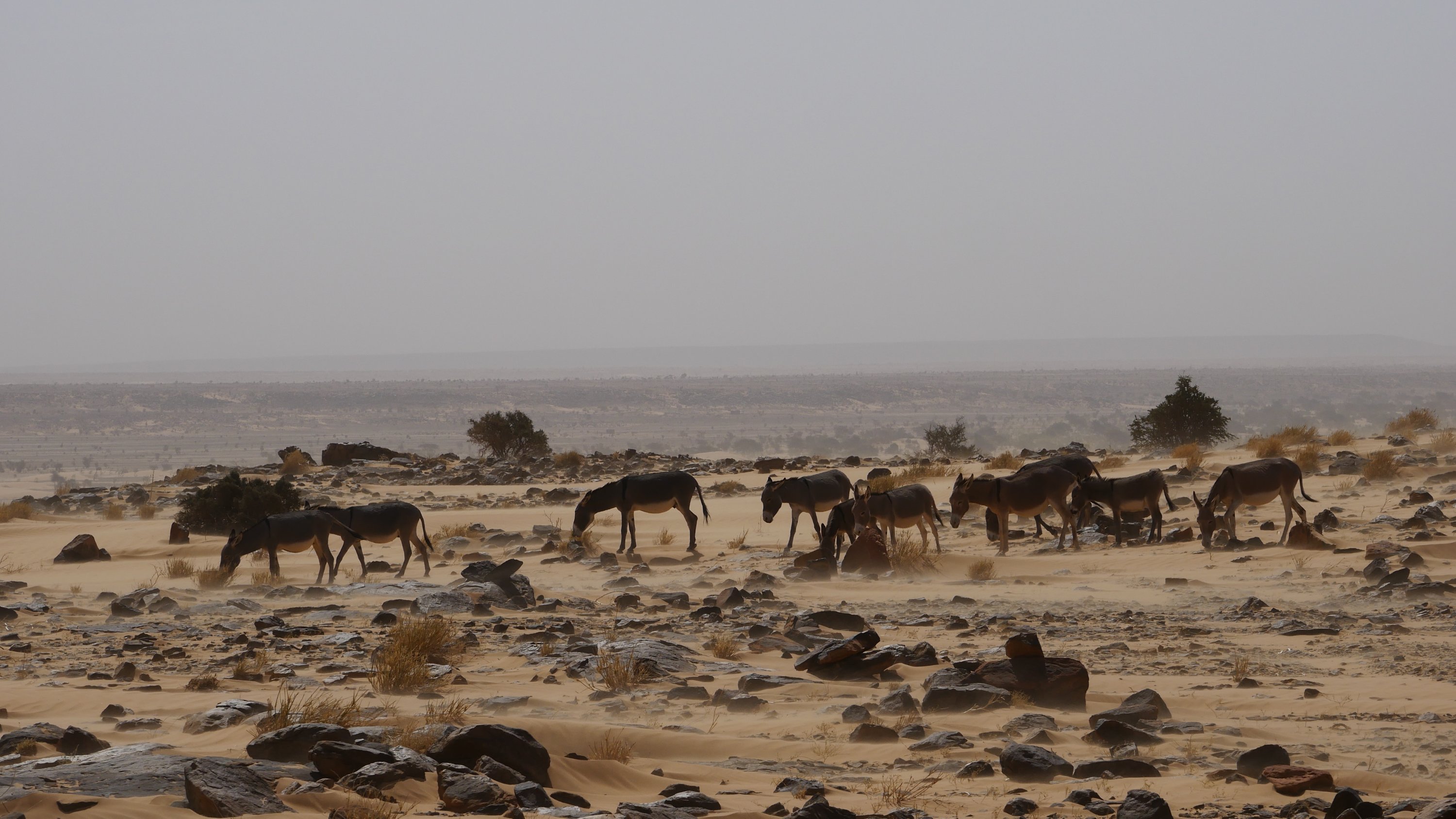 Wenig später fluchen wir allerdings, da ein kleiner Wüstensturm uns heimsucht und es uns 48 Stunden lang schwer macht, das Auto verlassen, ohne die Tür aus der Hand gerissen und einen halben Sandkasten in die Augen zu bekommen. Sobald wir auch nur einen Spalt im Fenster öffnen, legt sich eine feine puderige Sandschicht auf alles im Wagen. Die wilde Eselherde draußen stört sich am stürmischen Treiben hingegen nicht. Sie grasen einfach gemütlich weiter.