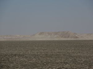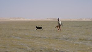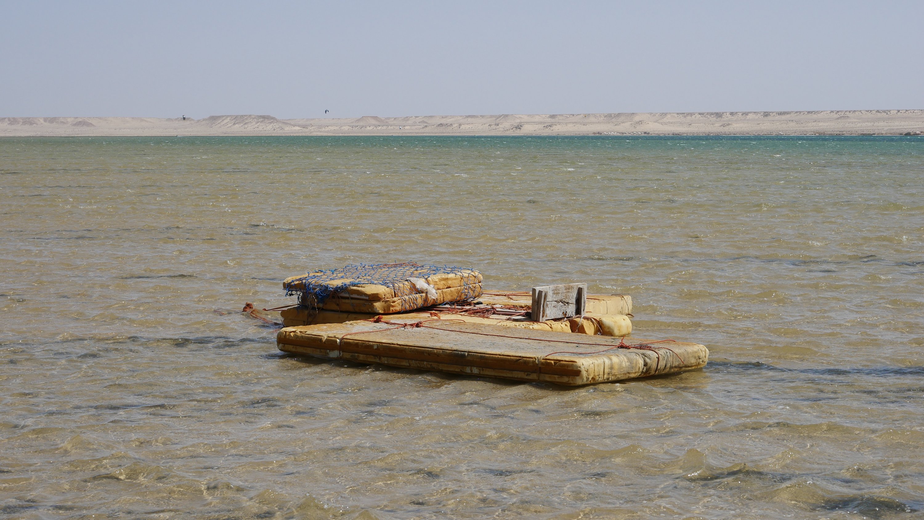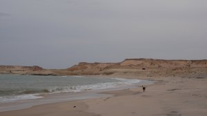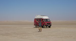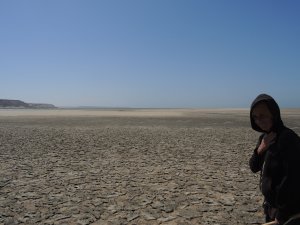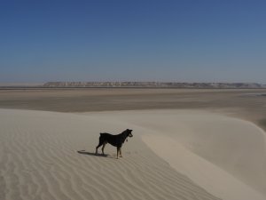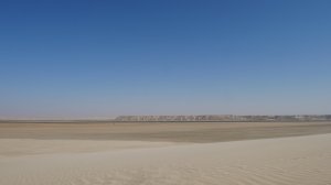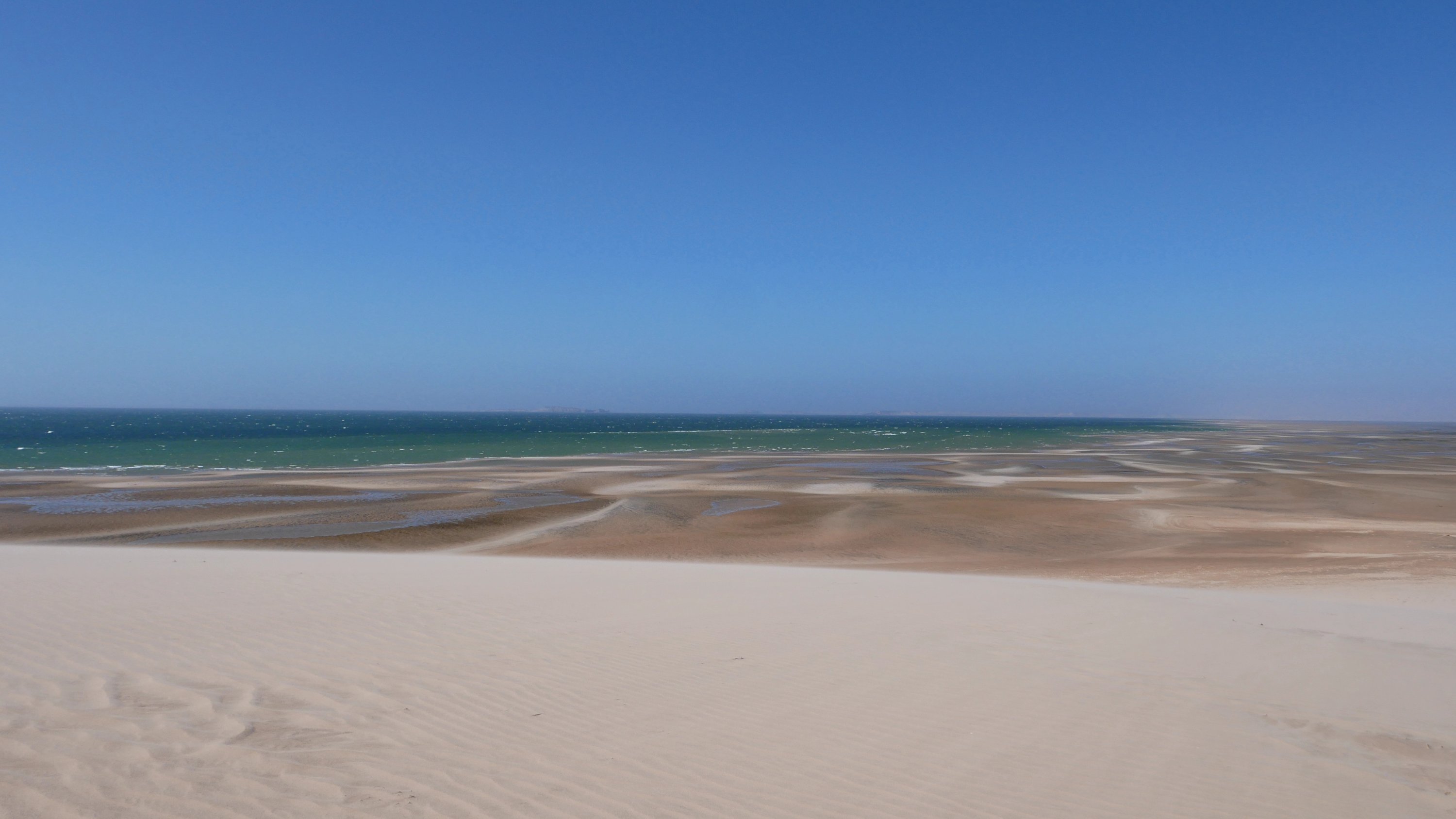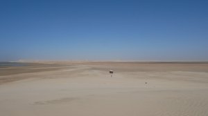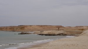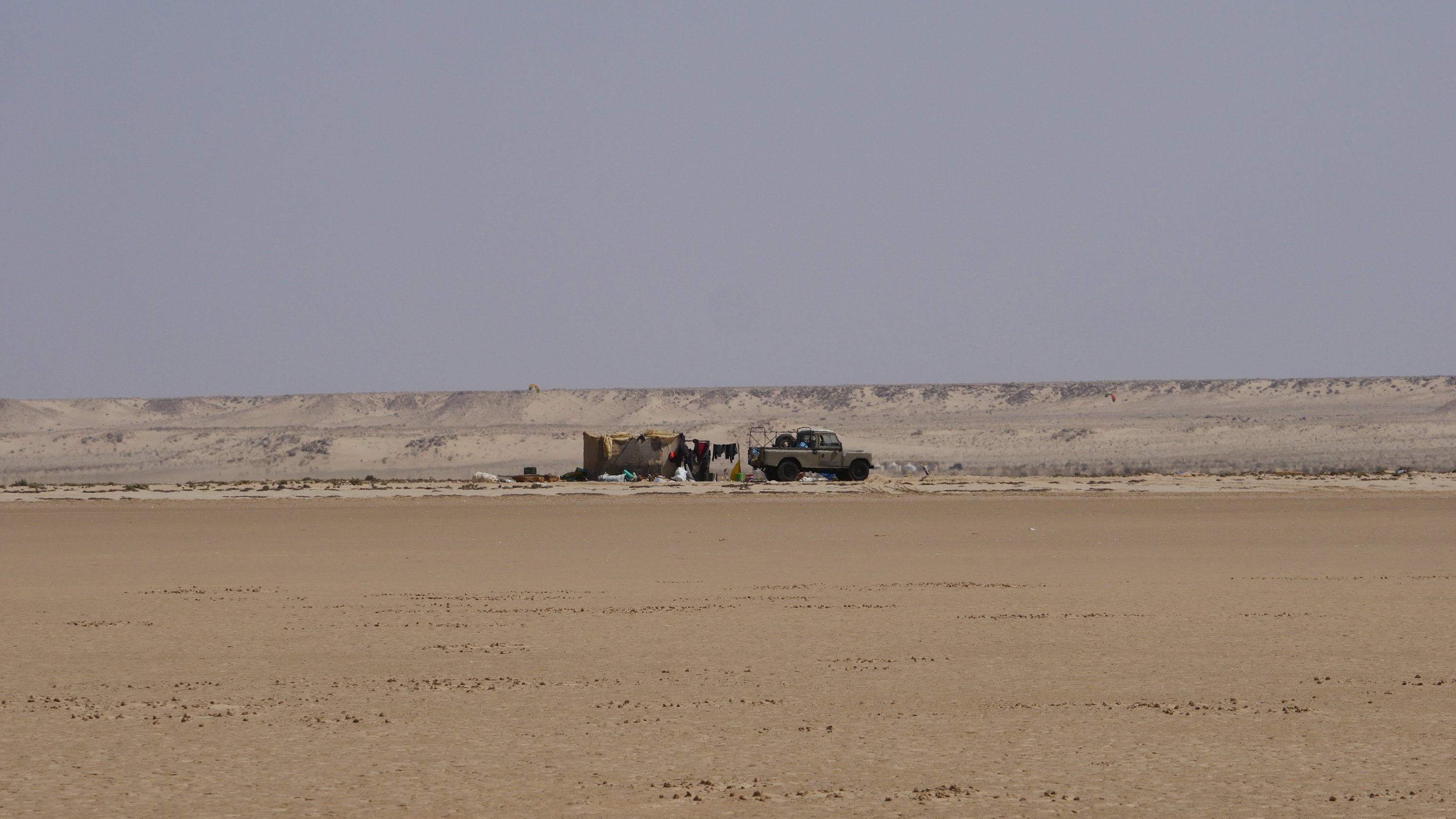 Wir fahren eine ganze Weile durch sandige Dünenlandschaft bis wir plötzlich auf der weitläufigen Lagune stehen, eine ebene Sandfläche mit fließendem Übergang ins Meer. Das Meer ist nicht sehr tief und sehr ruhig. Ungewöhnlich für West Sahara.