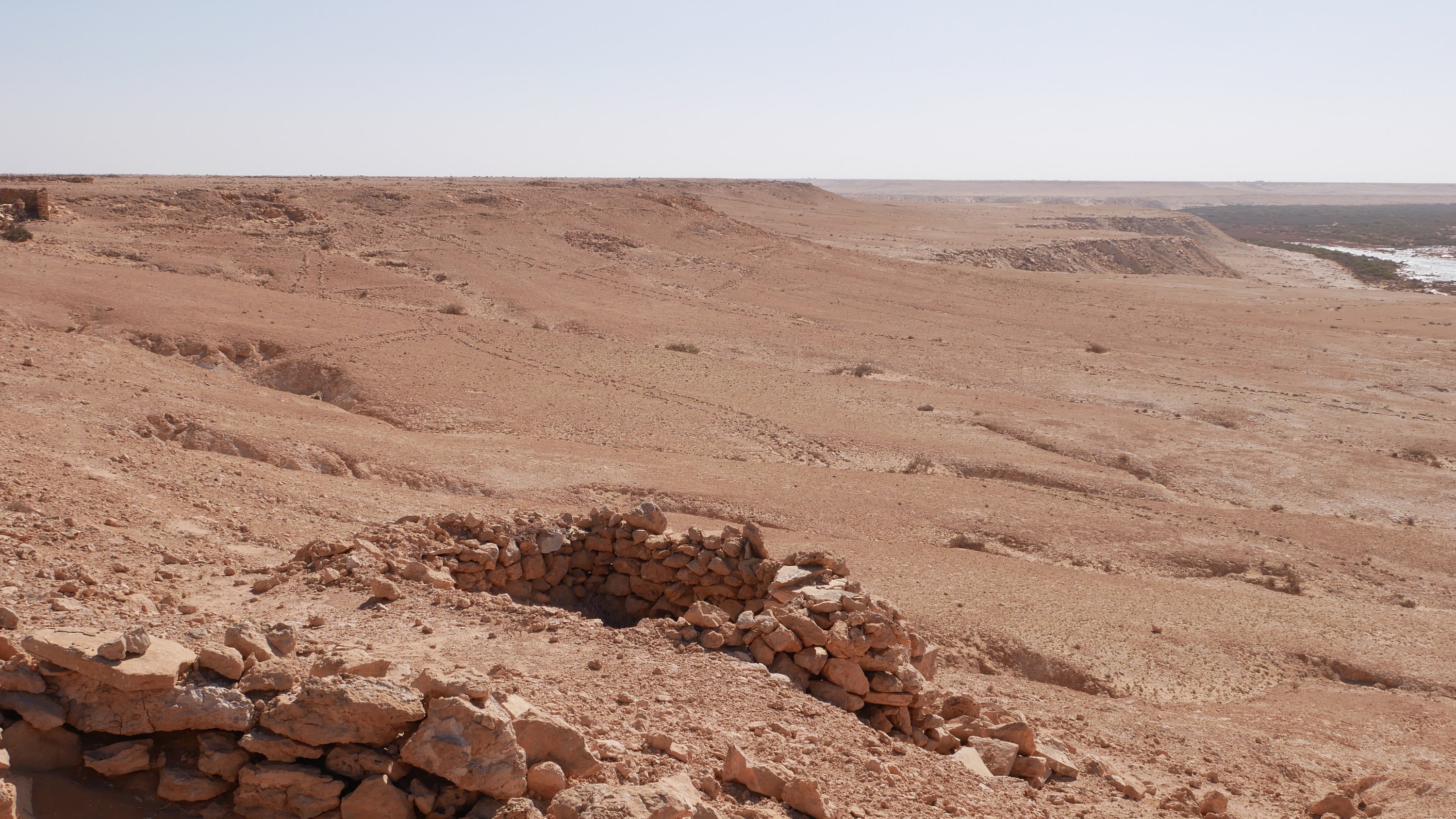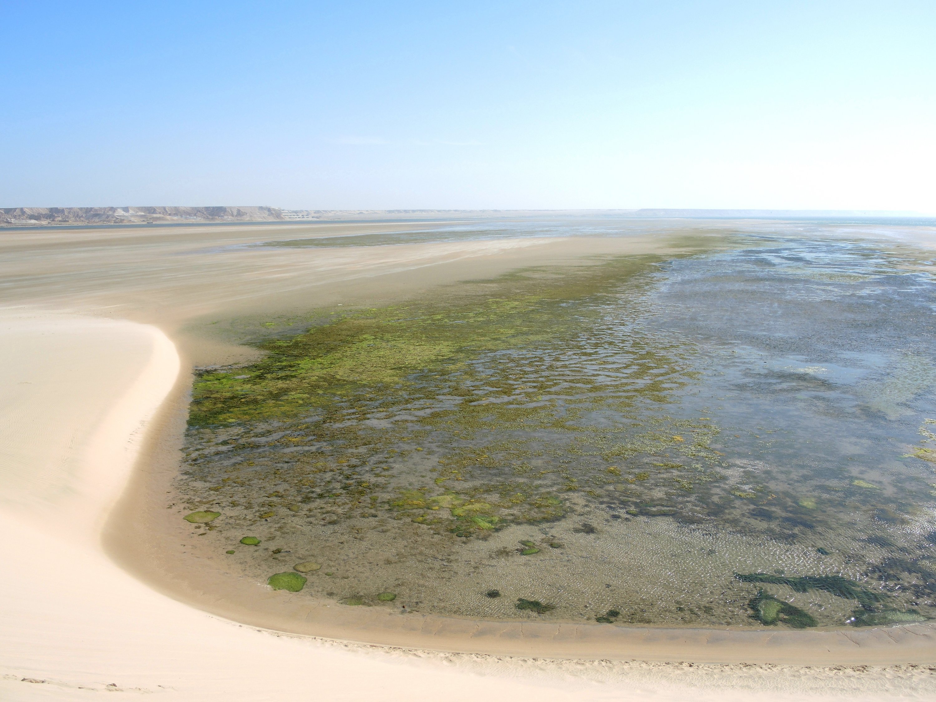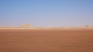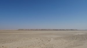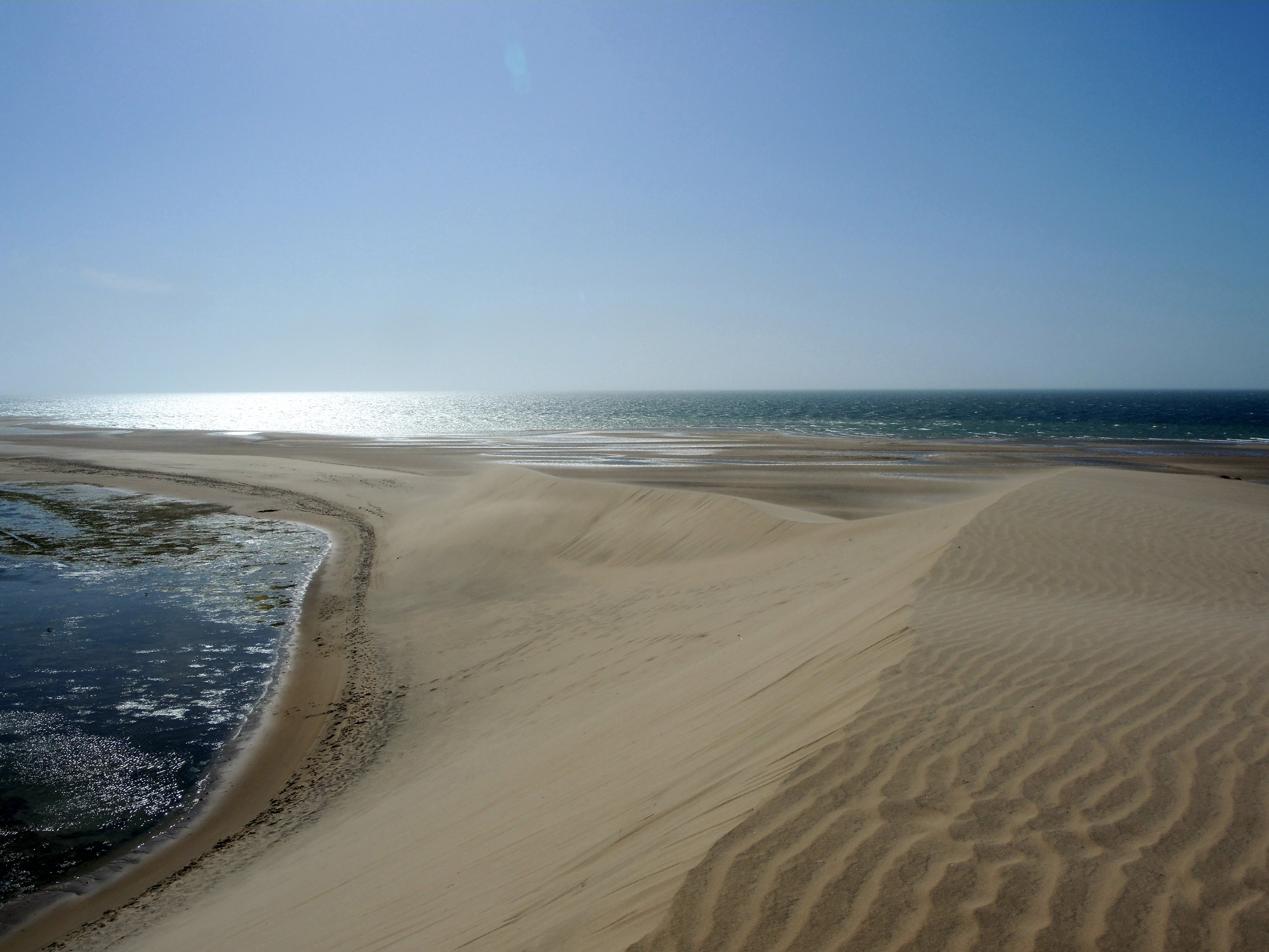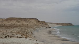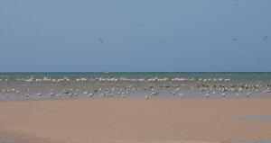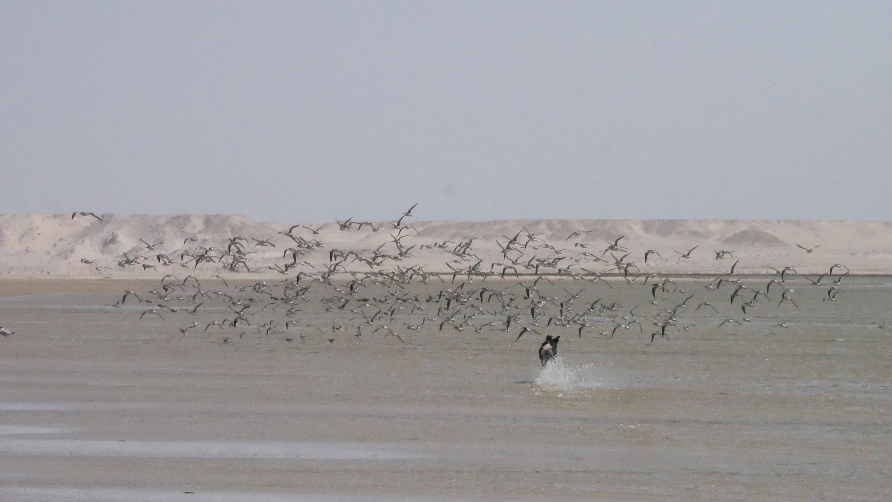 Wir fahren eine ganze Weile durch sandige Dünenlandschaft bis wir plötzlich auf der weitläufigen Lagune stehen, eine ebene Sandfläche mit fließendem Übergang ins Meer. Das Meer ist nicht sehr tief und sehr ruhig. Ungewöhnlich für West Sahara.