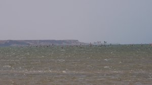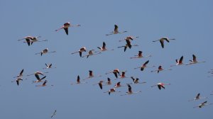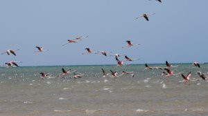 Morgens beobachten wir Vögel und haben Glück, dass ein Schwarm Flamingos hier Halt gemacht hat.