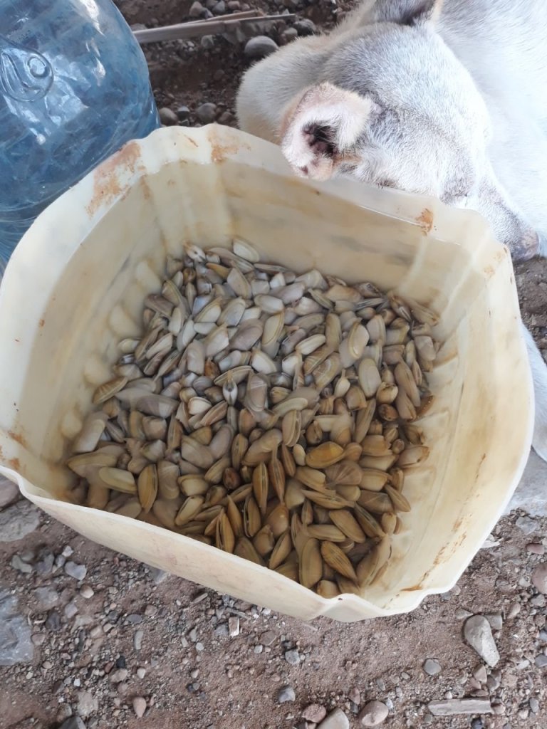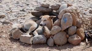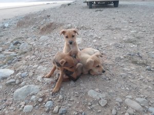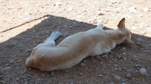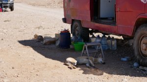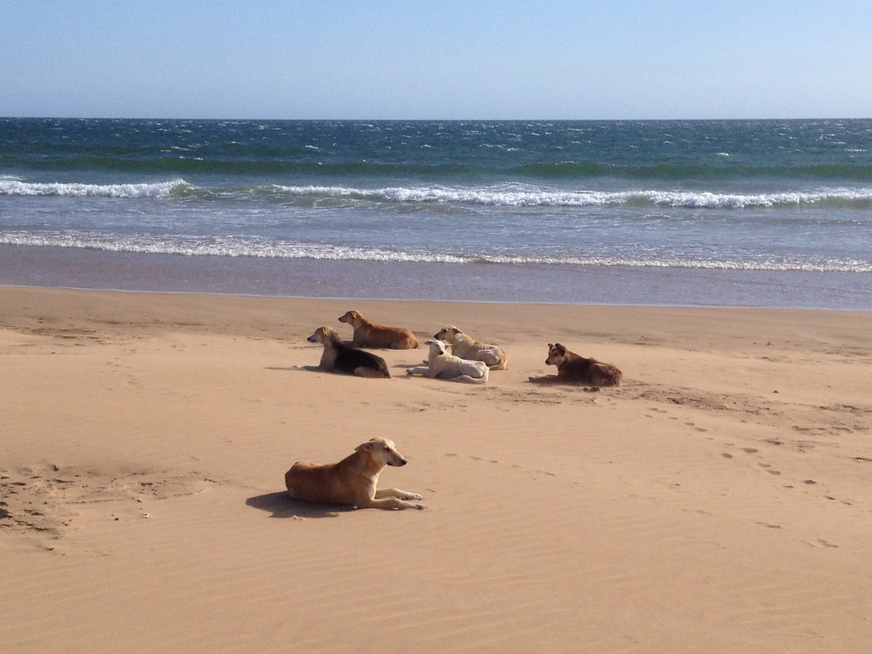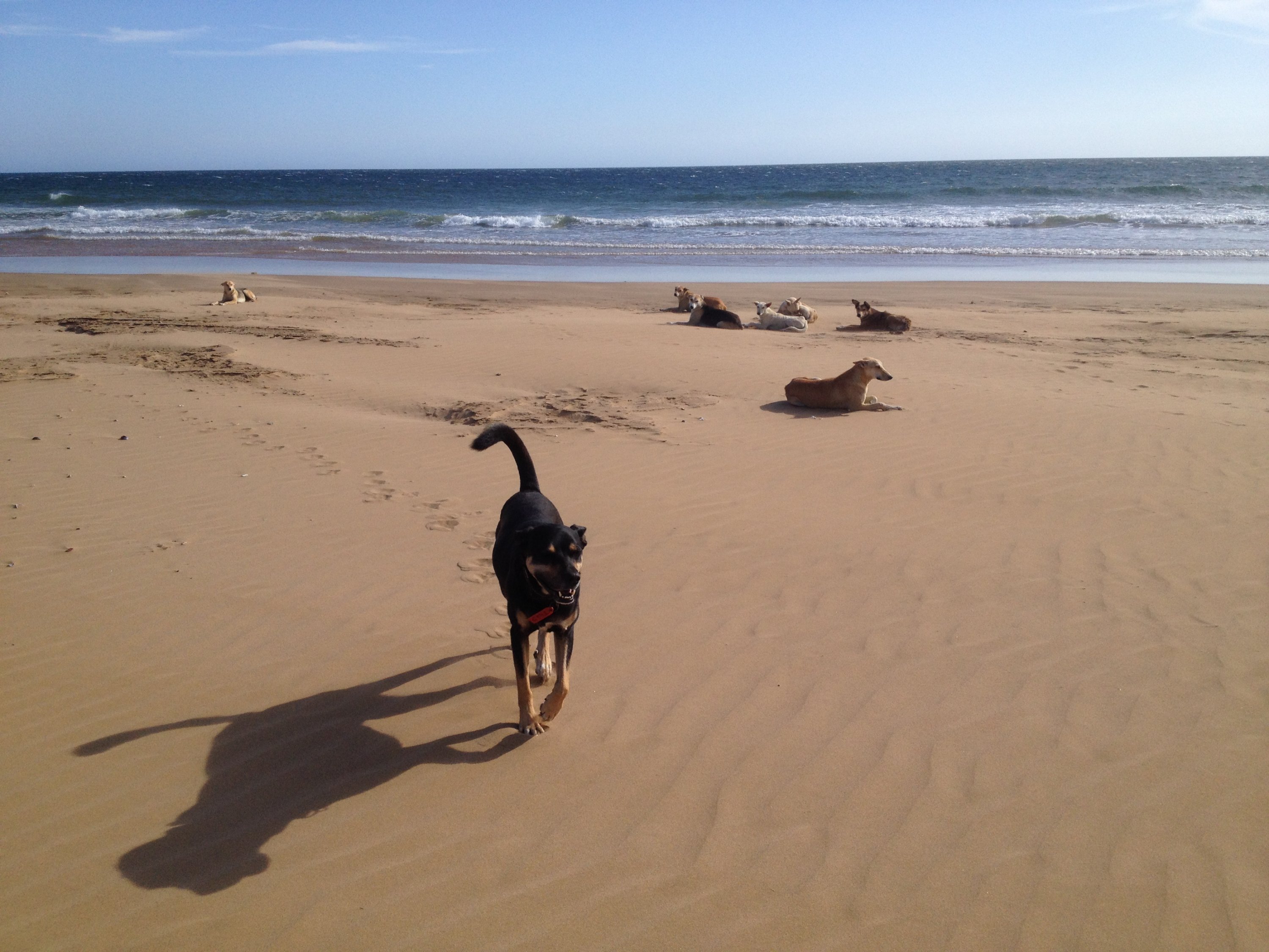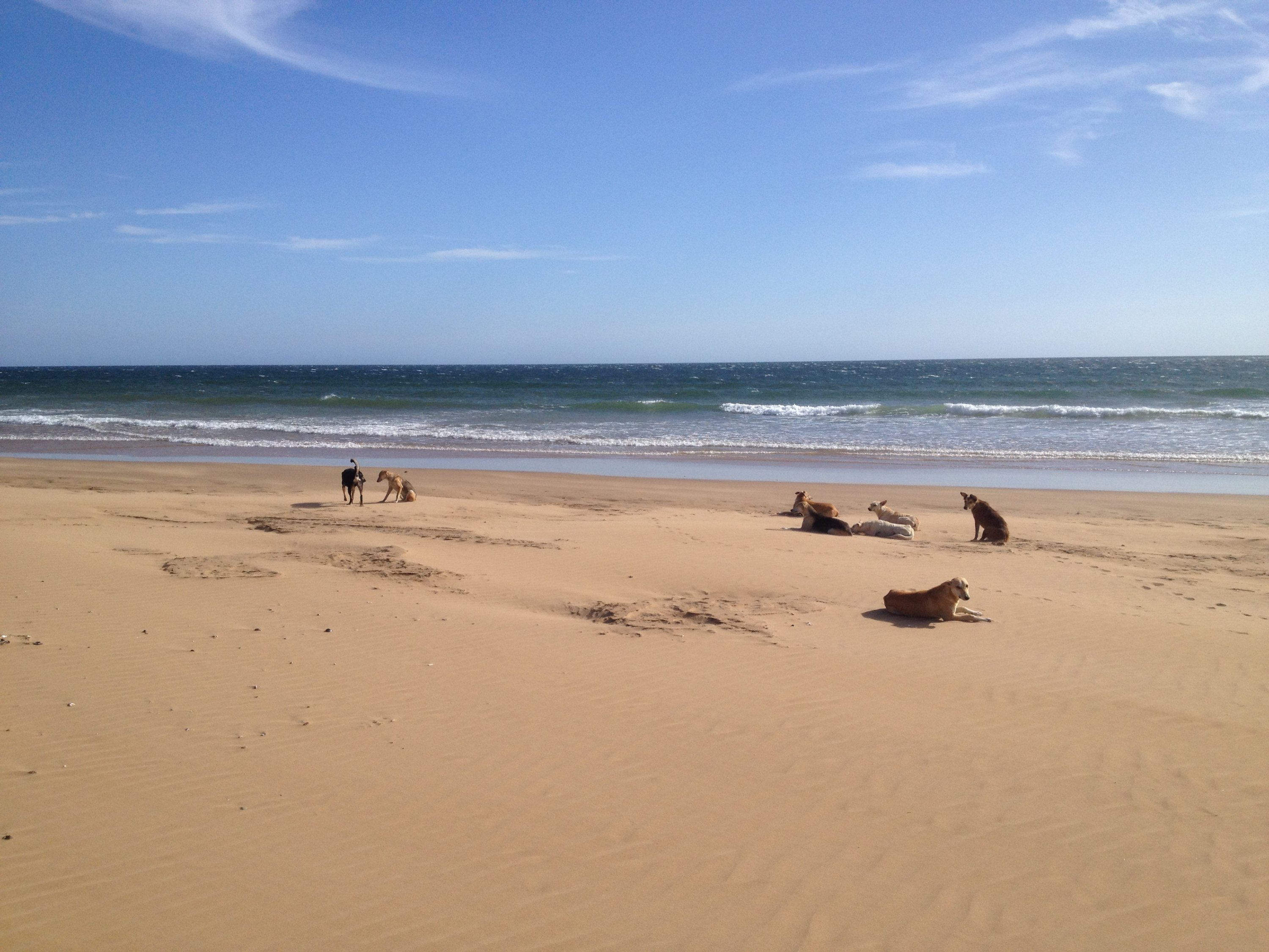 Um unseren Wagen herum lebt ein Hunderudel. 8 Weibchen und ein alter Rüde. Deren größter Spaß ist es, Spaziergänger am Strand zu jagen oder lästige Quads zu vertreiben oder rudelfremde Hunde. Sie sind harmlos, aber wenn alle neun auf einmal angejagt kommen, ist das schon beeindruckend.