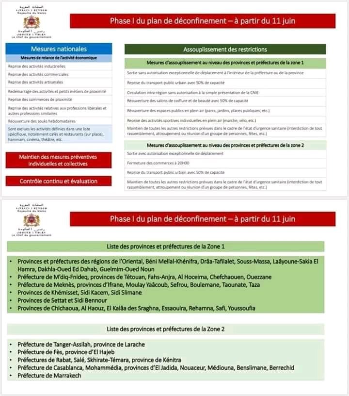 Seit 10. Juni ist Marokko in zwei Sektoren unterteilt, rote und grüne. In den grünen Provinzen (wie bei uns die Bundesländer) darf man sich nun wieder frei bewegen, Sport treiben, der öffentliche Nahverkehr hat mit 50% Kapazität seinen Betrieb wieder aufgenommen, Frisöre und Schönheitssalons dürfen öffnen. Man darf sich auf öffentlichen Plätzen aufhalten ohne Sondererlaubnis.