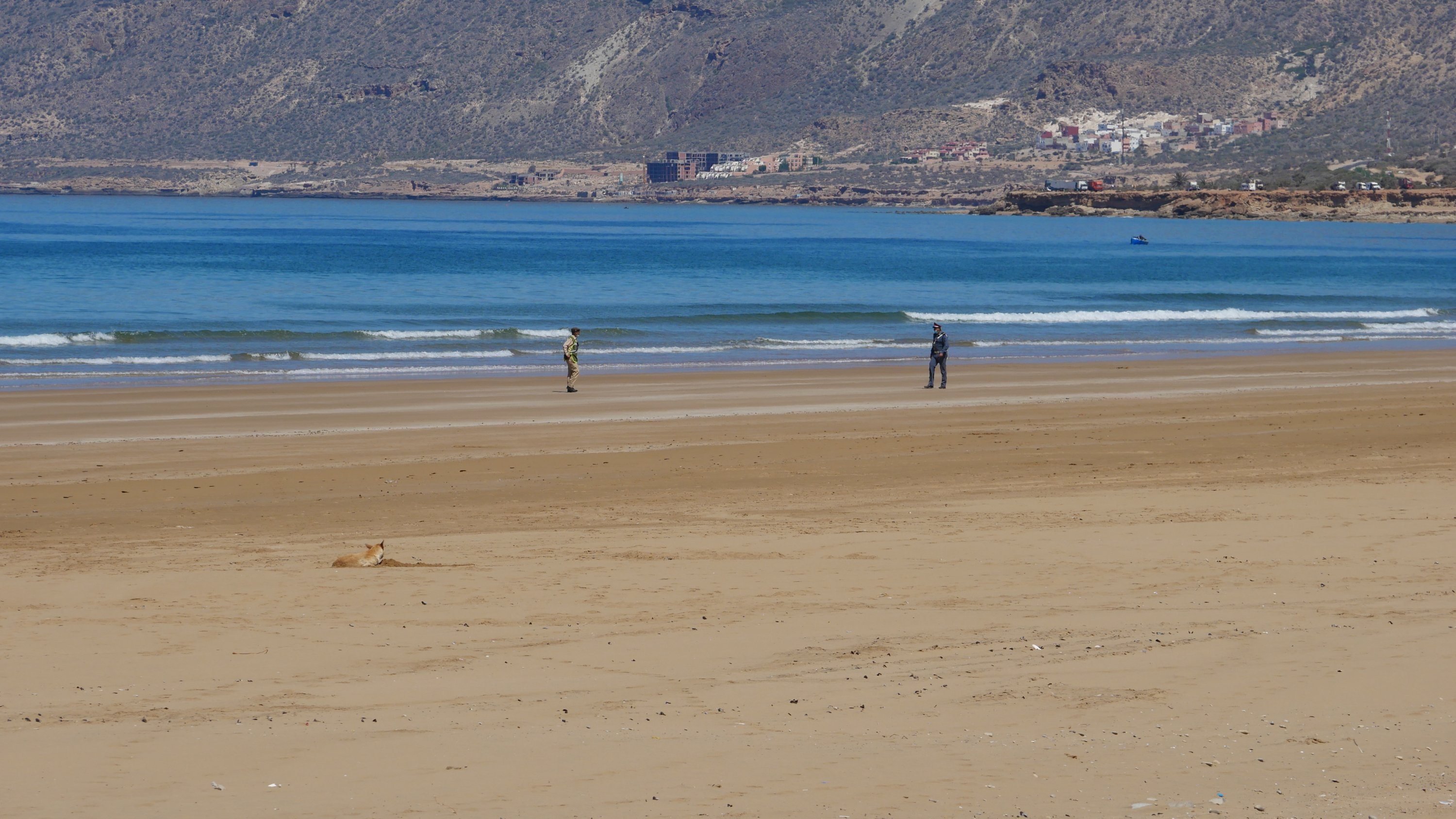 Genau wie die Marokkaner tun wir das natürlich trotzdem täglich mehrmals. Zwei Militär, zwei Gendarmen und ein lokaler Mann mit roter Armbinde haben die Aufgabe, den 2km langen Strand menschenfrei zu halten.
