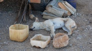 Dass sie ihn nur so umschwärmen, weil wir sie und ihre fünf Welpen regelmäßig füttern, haben wir ihm nicht verraten. Wir wollen ihm schließlich den Spaß nicht verderben. Seit neuestem schlafen auch die fünf Welpen des Rudels bei uns unterm Wagen, weil der französische Caravan neben uns, der sie bisher beherbergt hat, ein Ticket für die nächste französische Fähre bekommen und sich auf den Weg nach Norden gemacht hat. Heute morgen haben alle 5 Welpen in Roberts Feuerstelle gelegen und geschlafen.